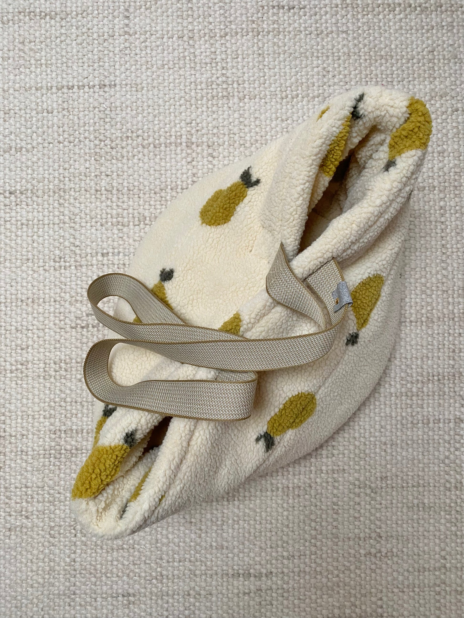 Aussen und innen Material flauschiger Teddystoff sowie langen Schultergurten zum umhängen. Innen mit Schlüsselband und Karabiner zur Befestigung von Leinen oder zusätzlicher Innentasche.